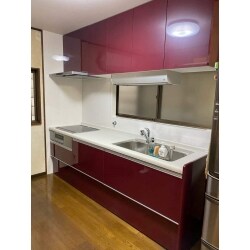 幅2400だったのをスペースがあったので 幅2550に大きくしました。 シンクの幅が大きくなってホットプレートが 洗いやすくなりました。 扉カラーはオペラチェリーです。