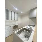 新築マンションのキッチンに棚板を2枚設置して収納力抜群に