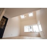 一階のLDKから二階の子供部屋へと吹き抜けになっており、LDKの開放感が増します。 天井が高いため、空間の上部にも窓を設けることができ、たくさんの光が降り注ぐ明るいLDKとなりました。
