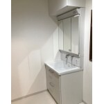 三面鏡引き出し収納、キャビネット取り付け、壁もクロスにして照明もLEDに交換いたしました。