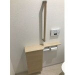 湯はり機能があるので洗い場側にサーモ水栓、壁に手すり兼用のスライドバーを取り付けました。