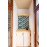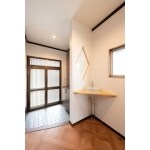 格子があった場所にあえて壁を立て、手洗いスペースを設けました。内装(特に壁紙の白さ)が変わっただけでも、玄関ホールが劇的に変化しました。