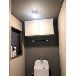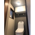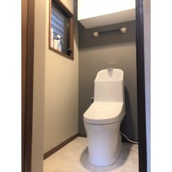 一体型のすっきりとしたトイレで節水にもなり、お手入れもしやすくなりました。 背面と天井のクロスをダークカラーのアクセントにしたことで、奥行き感が出てトイレが広く感じられます。 床もシンプルなものに張替て、イメージが一新しました。