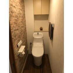 レンガ調の内装で落ち着きのある空間になりました。便器とタンクが一体型のトイレでお手入れが簡単になりました。手洗い器のボウルも深く、安心して手を洗うことができます。