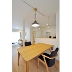 LDKはリビングとダイニングキッチンの間にあった間仕切り壁を取り払い、約16帖のワンルームに。白を基調とした内装に、北面だけライトグリーンの壁紙でアクセント。奥様のコーディネートでダイニングセット、ペンダントライト、時計などを配置し、ナチュラルで優しい雰囲気の空間に生まれ変わっています。