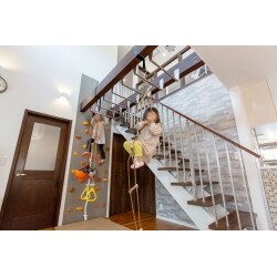 使っていない4.5帖の和室の位置に玄関を移動し、ホールとLDKを一体化。好きではないとおっしゃっていた吹き抜けの空間は、塞ぐのではなくその開放感を活かすアミューズメント機能をプラスすることをご提案しました。高さを生かしたボルダリングや縄梯子に雲梯、上部にはプロジェクターと大きなスクリーンも設置しています。水回りは1階に集約してそれぞれを拡大。バリアフリーになるよう段差を整え、1階の床を気密性の高い断熱材で覆いました。お父さまが感じられていた使いにくさや寒さも解消しています。