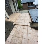 割れているブロックを交換し、古いブロックとアルミフェンスのコケや汚れは高圧洗浄で落とします。お庭の雑草は、土の上にシートをひいて化粧砂利を敷き詰めて仕上げます。玄関アプローチも高圧洗浄で汚れを落とします。