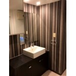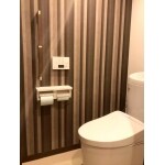 壁の1面を洗面室と同じストライプのクロスでアクセントのある内装にしました。 手摺はクロスに合わせてデザイン性の高いものを選定しました。