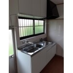 1800タイプのブロックキッチンで、正面に瞬間湯沸かし器がついています。吊戸棚は窓の上ではなく、横の壁に取り付けてありました。換気扇はフードが無い状態でした。