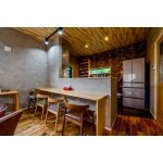 システムキッチンと背面に造作可動棚を設置して家電、食器、ゴミ箱等が収まる仕様にしてあります。