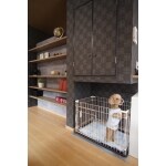 窓の位置を工夫し、近隣側のリビングの窓は上部に取り付け、視線が気にならないようにし、採光用の大きな窓は庭側に取り付けました。一面に可動棚と収納棚を作り、リビングに必要なものやペット用品はここにすべて収納できるようにしました。トイプードルのゲージ置き場をリビングの中心に持ってくることで、家族がどの場所にいても気配を感じられるようにしました。