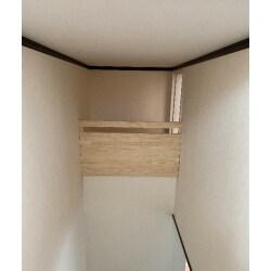 2階から3階の階段上部に棚があるが、簡単に手が届かずデッドスペースになっている。そこに猫ちゃんのトイレを設置し空間を有効利用したい。