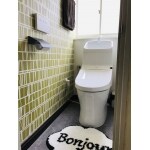 最新の節水一体型便器に取替え、入口ドア上にも奥行の浅い棚板を追加しました。 アクセントクロスとコンクリート調の長尺シートでおしゃれな仕上がりになりました。