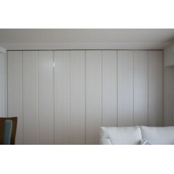 リビング横の洋室との間の間仕切壁を撤去し、可動式建具を取りつけました。建具を全開すると一部屋になり、かなり広い空間になります。