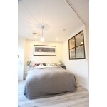 収納は取り払い、壁も窓を入れることで一機に垢抜けました。照明器具はペンダントのおしゃれな照明とダウンライトを組み合わせています。床も白い木目にして、壁紙も独特な高級感がある柄を選びました。