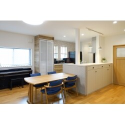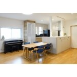 柱を1本残し、ダイニングとキッチンの間の壁を取り払い、一つの空間に。キッチンを中心に家事室、洗濯スペース、ダイニングと動線をよく配置。収納は食品庫、掃除道具、勉強道具、書類、洋服部屋とそれぞれ分けて配置。箪笥や食器棚を減らし、すっきりした空間に。