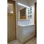 広い洗面脱衣所に、大容量の収納棚を設置いたしました
