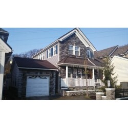 お客様のこだわりのデザインでエルドラドストーンを正面に貼り、他は樹脂サイディングでカバー。窓廻りや妻飾りでより輸入住宅らしく。屋根は石を吹き付けた板金を上からカバーすることで、より長持ちさせます。