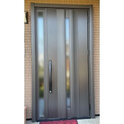 ・既設のドアと同じ大きさの、ハイサイズモデルへ交換しました。 ・黒色のサッシに合わせて、玄関ドアも濃く落ち着いた色で、スッキリしたデザインをお選びいただきました。