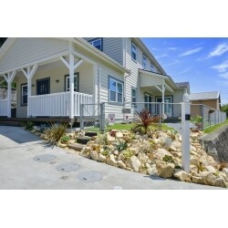 法面の芝生は剥ぎ取り、ナチュラルな大小の石を積んで間に植栽を入れていきました。石はEXISLANDの「ナチュラルロック」という石を使い、濡れると色が濃くなり、雨の日にはまた違った顔をみせてくれます。お家やアメリカンフェンスともマッチしています。