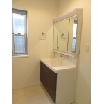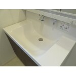 お掃除を楽にということで、水栓周りに水が溜まらないタイプをご提案させて頂きました。 また生活感をあまり出したくないということで三面鏡の裏に収納があり隠せるタイプをご提案させて頂きました
