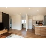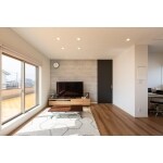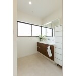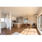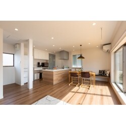 キッチンとサニタリーは直線で結び家事動線を短縮したご提案となります。。料理と洗濯など、家事を並行してこなせます。 キッチンから洗面室、廊下へとぐるりと回遊でき、生活動線もスムーズになります。 リビング、ワークスペースの間の壁をなくしたことで、 ご夫婦の仕事や、子ども達の学校の資料も管理しやすくなりました。 ワークスペースは家族みんなで使うことができます。