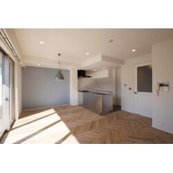 間取りの変更は行わず、内装部分をお好みのデザインへとリノベーションされました。 リビングに施されたヘリンボーンの床と、鮮やかなライトブルーのアクセンクロスが印象的で、ステンレスのキッチンはお施主様のこだわり。 ヨーロッパで生活されていたこともあり、伝統的なデザインをリノベに活かしました。 居室にはミントグリーンのアクセントクロスが施され、統一されたテイストでありながらも、お部屋ごとに違う表情を持たせています。
