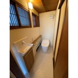 浴室をユニットバス化、廊下と洗面が分かれているため、間仕切りをとり洗面脱衣室として広くとりました。 それに伴い、窓、勝手口はアルミサッシに改修。 雪隠便所から下水に接続し、水洗トイレ。 既存地窓や建具は既存再利用し昔の面影を残して、内装はクロス、クッションフロアにリフォームしました。 縁側はアルミサッシ、縁側は縁甲板にやり替えました。