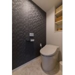シックでかっこいいアクセントクロスと、収納スペースには木製のカゴを使い、お二人の好みに合わせた、ナチュラルモダンなトイレ空間が完成しました。