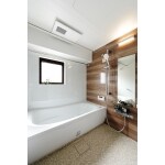 532.セブストーン柄のアクセントパネルで温かみある浴室