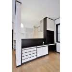 ・廊下部分を水廻りスペースに吸収することによって、全体的にゆとりを生み出しました。お風呂は1120から1621サイズになり、保温性能が抜群にUP。 ・キッチンは対面キッチンとし、背面にめいっぱい収納できるスペースを取りました。キッチンの前に造作で造ったカウンター収納は、キッチン側からも使用できるようになっていて、手元を隠しつつ調味料等の細かいものが収納できるようになっています。