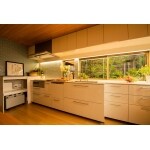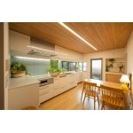 細長いスペースにキッチン、浴室、トイレと、リフォーム前は脱衣室がなく「あれ、洗濯機はどこですか」と聞くと 「実はね。ここながよー!」と浴室の窓を開けるとこんなところに!!お施主様も「変わったところにあるろー(笑)」 と和やかな雰囲気で現調を終えた事もつい最近の出来事のようです。キッチンから裏庭のグリーンを眺めたい!との ご要望。キッチンの天端から吊戸まで開口部とし、吊戸裏に間接照明を取り入れました。またメインとなる照明 も天井高が2200mmと少し低めだったので、羽目板天井の目地ラインに沿って埋め込みの照明としスッキリとさせました。 冷蔵庫も階段下を有効利用して出来るだけダイニングを広く!シンプルなデザインではありますが、朝から夜になるにつれて、間接照明の演出でキッチンの雰囲気が変わっていきます。『夕暮れ時々ワイン』これから奥様とお二人の時間を 大切に過ごして頂きたいです。