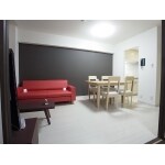 赤いソファがメインになるようなお部屋をご提案させて頂きました。 壁を一部分だけ黒にするだけで引き締まって大人な空間になりソファとも相性のいいお部屋になったかなと思います。