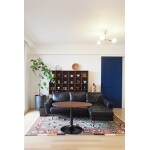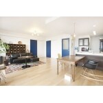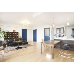 ・LDKを広げるため、西洋室をつぶし、マンションなのに洗面脱衣室と浴室を西に移動。ブルーの建具がアクセントの広々としたLDKが実現。色はご夫婦で幾度もサンプルを見て厳選したカラー。 ・マンションでキッチンを移設する際は配管経路を隠すために床を一段上げる事がよくあるが、M様は、「必要以上に上げたくはない、フルフラットのLDKが良い」との強い希望で、ほんの一部ダイニングテーブルの下だけに留めた。そのお陰でその他は快適なフルフラットに。