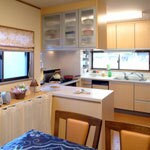 システムキッチンの高さをシンク側86cm、ガス側81cmにしました。(加熱調理の作業のしやすさを考慮してガス側を5cm低くしました。)これは奥様と何度かショールームで体験して頂き決定しました。抜けない柱を利用して調味料や鍋の収納に。写真左の窓下に奥行25cmの収納の他、パントリー、野菜の一時置き場、ゴミ置きなど造作しました。床材は足腰に負担のかからないコルクフローリングで施工しました。
