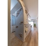 キッチンへの2WAY動線を確保しました。壁は左官仕上げにブリックタイルをあしらい、入口をアーチ状に。内部壁面には花柄のエレガントな輸入クロスを貼った機能的でたっぷり収納できるパントリーとしました。
