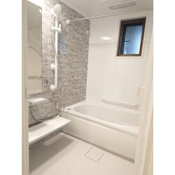 壁床浴槽は白く、鏡面石目柄のアクセントパネルで浴室全体が爽やかで高級感ある空間になりました。浴室パネルは汚れが落ちやすく、床も水はけがよいのでお手入れもラクになりました。床にも断熱材がはいっていて足元が柔らかく、冬でも足元の冷たさを感じなくなりました。
