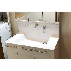 w=750だった洗面台をw=900のゆったりとした洗面台へ変更。 ボウル底から水栓までの高さがしっかりある為、身長の高いご主人や息子様が使いやすくなりました。