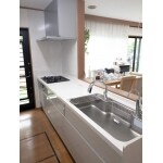 お風呂はお手入れのしやすさ、キッチンの収納スペースを増やすことに重点をおいて商品仕様を決めていきました。 今回はお風呂、キッチンともにL社を採用。 お風呂はカウンターをあまり使わないとの事で取り外し可能なカウンターのあるタイプをセレクトしました。取り外しできる事で洗い場スペースを広く活用でき、カウンター周辺のお掃除も簡単にできます! キッチンは大きなスライドドア収納キャビネットを設置し、食器や小物を沢山収納できます。家電収納キャビネットもついているのでカウンターに置かずにスッキリと収納できます!