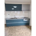 2階の洋室とキッチンの間仕切り壁を撤去して開放感のある空間になりました。 キッチンはTOTO ザクラッソを採用しました。 扉のラピスブルーグリーンが空間のアクセントになっています。 床のフロアタイルは、まるで本物のような質感。バツグンの耐久性。ビニル素材なので水にも強く、日頃のお手入れが簡単です。1枚ずつ敷き詰めていく施工方法なので、汚れた部分のみを交換することもできます。