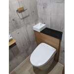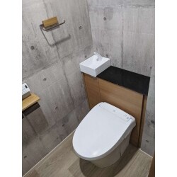 収納付きトイレにすることで、トイレ自体の見た目をすっきりと、また掃除のしやすい+αの要素が入ったトイレにしました。 内装をコンクリート調にすることでお店にあるようなかっこいい雰囲気へと変えました。