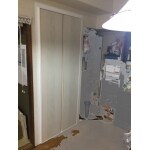 ・扉を構成する部品の損傷(破損)が不具合の原因だったので、部品交換で対応予定だったが、メンテナンス用パーツの供給が終了していたため、扉枠と扉をリフォーム用の新規製品に交換。 ・開閉方式を「折れ戸式」から「開き戸(観音開き)」に仕様変更。