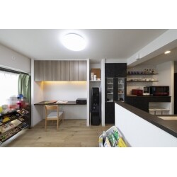 LDKを⼤きく取り、リビング内にで学習スペースや収納を盛り込みました。 キッチンスペースも⼤きく取り、アイランドにして回遊性を持たせました。 今までは、キッチンを通らなければ⾏けなかった北側の洋室はキッチンを90度向きを変えたことにより、独⽴した個室にする事ができました。こちらは防音室になっており、いつでも気兼ねなく楽器の練習ができる趣味のお部屋になりました。 各収納内部は、奥様のお好きなムーミン柄にして、お片付けも楽しくできるようになりました。