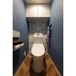 エンボス加工されたネイビークロスと、おしゃれなヘリンボーン柄のクッションフロアで落ち着きのある北欧風のトイレは、奥の壁にアクセントクロスもあしらってかわいさもプラス。 お掃除などのお手入れがラクなトイレは、大人から小さな子まで使いやすい広く深い手洗いで、だれにとっても使いやすいものに。 吊戸棚をつけて、トイレットペーパーなどのストックも便利になりました。