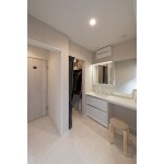 お仕事が終わる時間が遅いご家族を起こすことがないように、生活・家事の動線を考えられた洗面。 洗面の近くに収納を設けることによって、身支度を一か所で済ますことができ、お洗濯したものをそのまま片づけられ、忙しい毎日の家事をスムーズに。 カーテンで仕切ったウォークインクローゼットは、少ない力で開け閉めができるから、両手がふさがっていたり、小さいお子さんでも簡単に出入りができます。お客様に洗面をお貸ししたときにも目隠しも。 ワイドカウンタータイプの洗面だから、朝のお化粧や簡単な家事がゆったり余裕をもってでき、ユーティリティ的な役割も果たせます。
