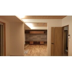 イメージ写真をご提示いただいたことにより、早い段階でご要望に沿ったご提案を差し上げることができました。フローリングは無垢のオーク、天井は米松で仕上げています。2×4建物のため、撤去できる壁や梁が少なかったため、間接照明の造作に活かしています。