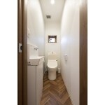 ホワイトを基調とした空間にヘリンボーン柄の床が目を引くナチュラルな空間に生まれ変わったトイレ。 トイレは劣化などが少なくそのまま使えるので、内装を整えて雰囲気をがらりと変えました。タイルの床と壁に囲まれて、どこか寒々しさと薄暗さが感じられていたので、タイルからクッションフロアに変え、断熱性・防露性に優れた窓に交換し心地よい空間へ。 スリムなハイバックタイプの手洗い器は、掃除道具なども収納ができるキャビネットを備えていて収納性も備えています。 ドア横のスイッチは人感センサーを採用し、夜でもスイッチを探さなくてもOK。