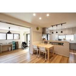車いす⽣活になるご主⼈様が使い勝手が良い空間は⼤前提ですが、奥様と⼦供たちも楽しく快適に過ごせる空間を考えました。 ナチュラルテイストでわんぱく盛りのお⼦さまたちにご希望の雲梯も設置、車いすと健常者が⼀緒に家事ができる空間です。