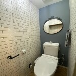 LIXILアメージュZ便器とシャワートイレKBをご提案。 クロス壁をレンガ調のお洒落なデザイン、アクセントクロスをリラックス効果のあるグリーン系統を採用。床は木目調のクッションフロア。カフェにあるトイレのような空間を、イメージしご提案させていただきました。