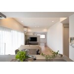 リビングから廊下のドアは光を遮らないものにし、家の中全体を明るく、水まわり隅々まで風が通るようにしました。 家事動線にもこだわり、小さなお子様の様子をみながら家事ができるようキッチンも対面に。 お子さまの成長とともに増えていくモノを片付けられる大きなウォークインクローゼットは、扉を3つにしたことで風通しも良く湿気がこもらないように。取り出しやすくしまいやすいように棚やハンガーポールを設置しました。 デザインにもこだわりキッチン上の梁を利用して間接照明を設置。白い壁に反射して優しい明りを落としてくれます。 施主様が育てた観葉植物たちが各所にセンス良く飾られ、無機質になりがちな白基調の室内に柔らかな雰囲気をつくりあげる素敵なお住まいになりました。